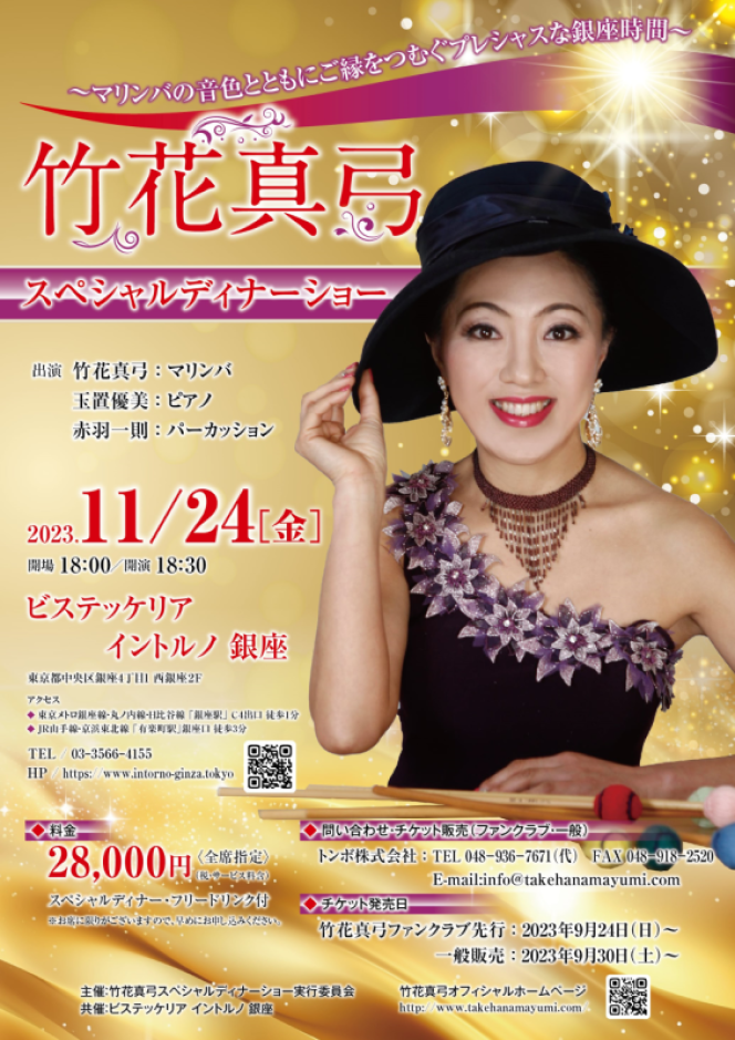 ● 2023年11月24日 竹花真弓スペシャルディナーショー~マリンバの音色とともにご縁をつむぐプレシャスな銀座時間~のご案内