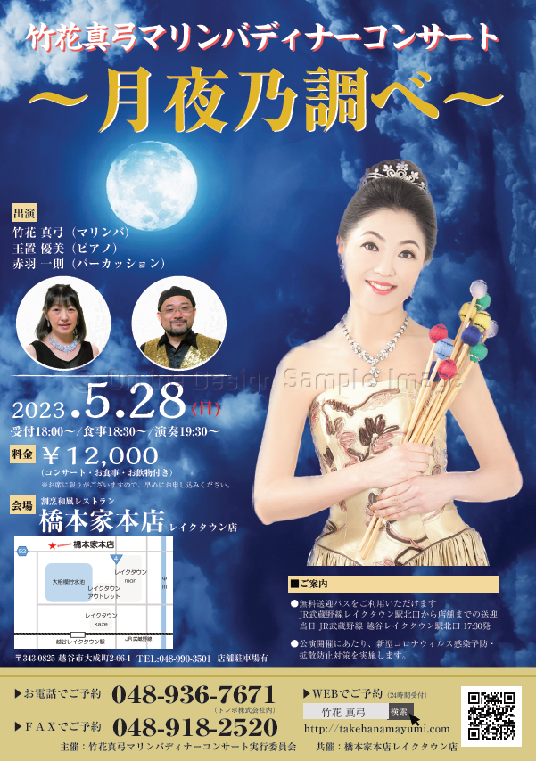 2023年5月28日(日)に「割烹和風レストラン 橋本家本店レイクタウン店」にて、「竹花真弓マリンバディナーコンサート~月夜乃調べ~」を無事終えることが出来ました。これもひとえに、皆様のご支援とご協力あってのことと、深く感謝しております。